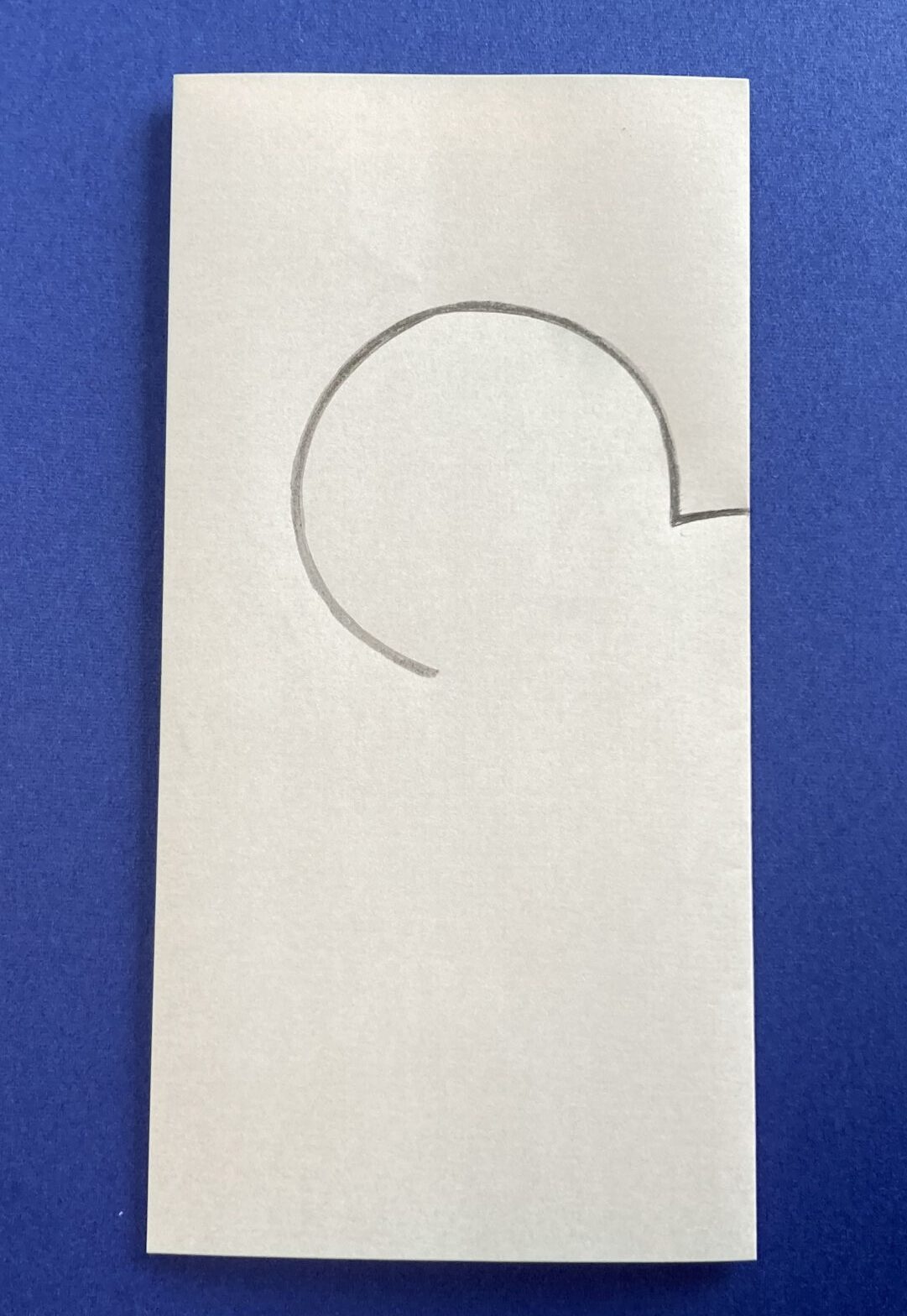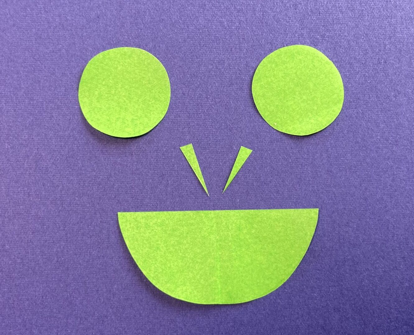 ⑥写真のように、弧(カエルの口)を描きます。また、小さな直角三角形を描き、鼻も作りましょう。