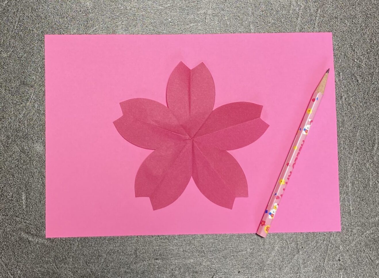 ①先ほど作った型紙をピンクの画用紙上にのせて、鉛筆でなぞります。